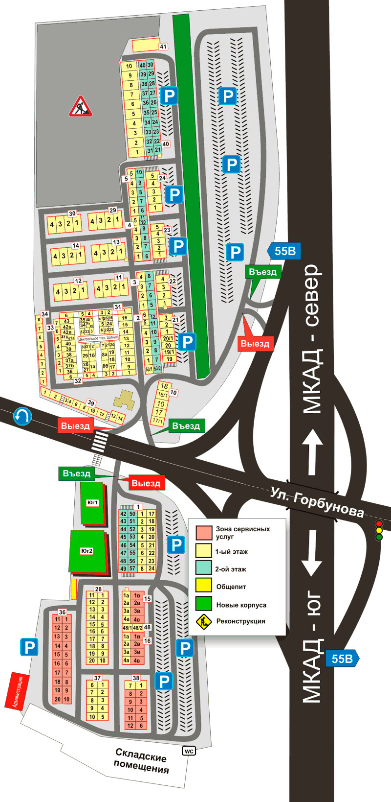 - С внутренней стороны МКАД: поворот 54В,55В на улицу Горбунова, на первом же светофоре у поста ГИБДД поворот налево, проезд по мосту над МКАД порядка 100 метров, по правую сторону будет въезд на Северную сторону торгового комплекса, проехав по прямой и развернувшись можно попасть на парковку Южной стороны комплекса;